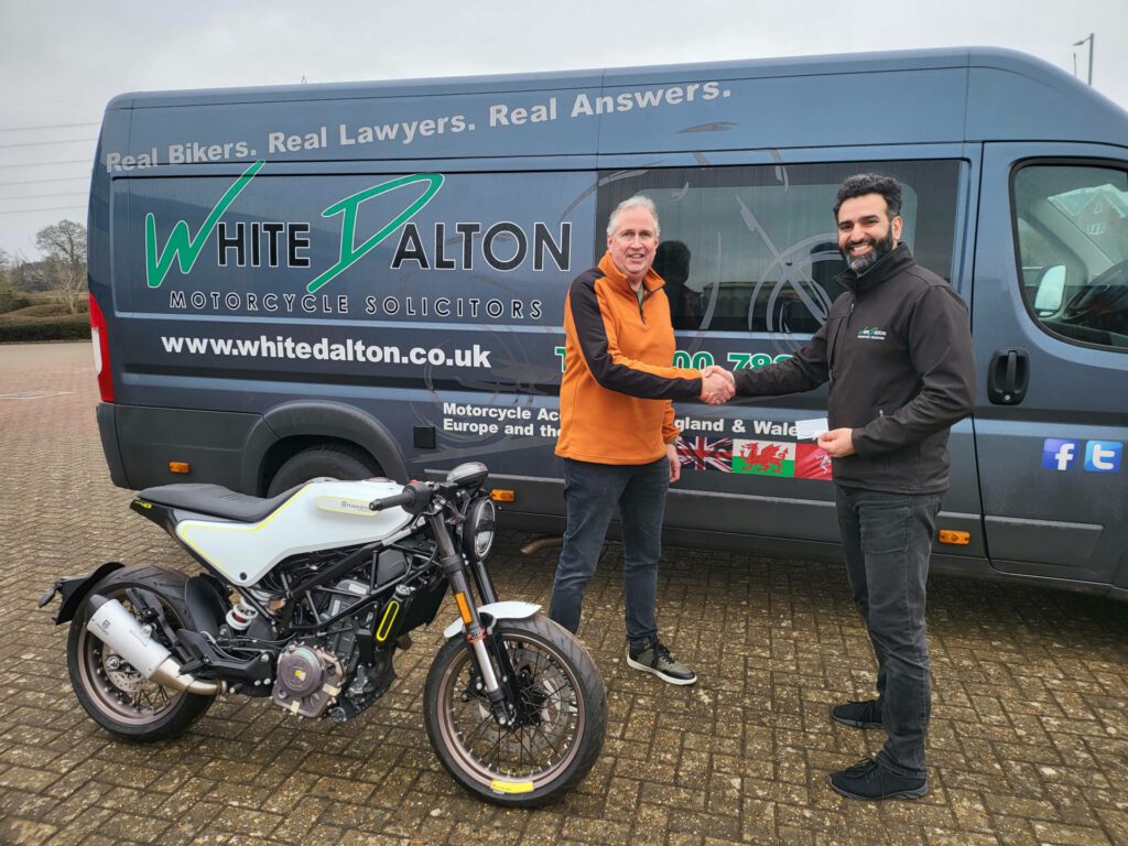 Dave and his partner Carenza have been collecting their prize cards for years and could not believe their luck when Dave’s number came up (Carenza religiously labels the cards and checks them every week). Congratulations to Dave from everyone at White Dalton Motorcycle Solicitors. Enjoy the bike!