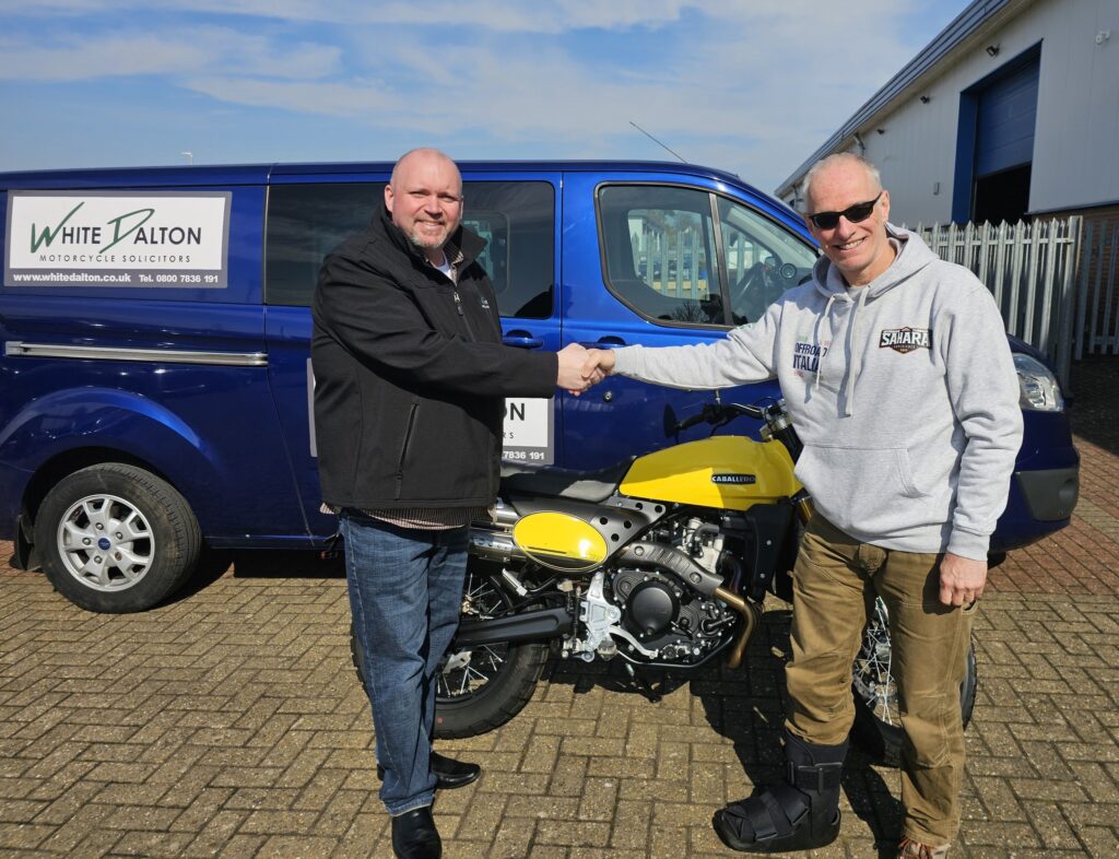 Andrew Prendergast, Senior Partner at White Dalton, presented Russ Segalov with the Fantic Caballero in a dashing shade of yellow, just in time for great biking weather. Well – once his foot’s healed up!
